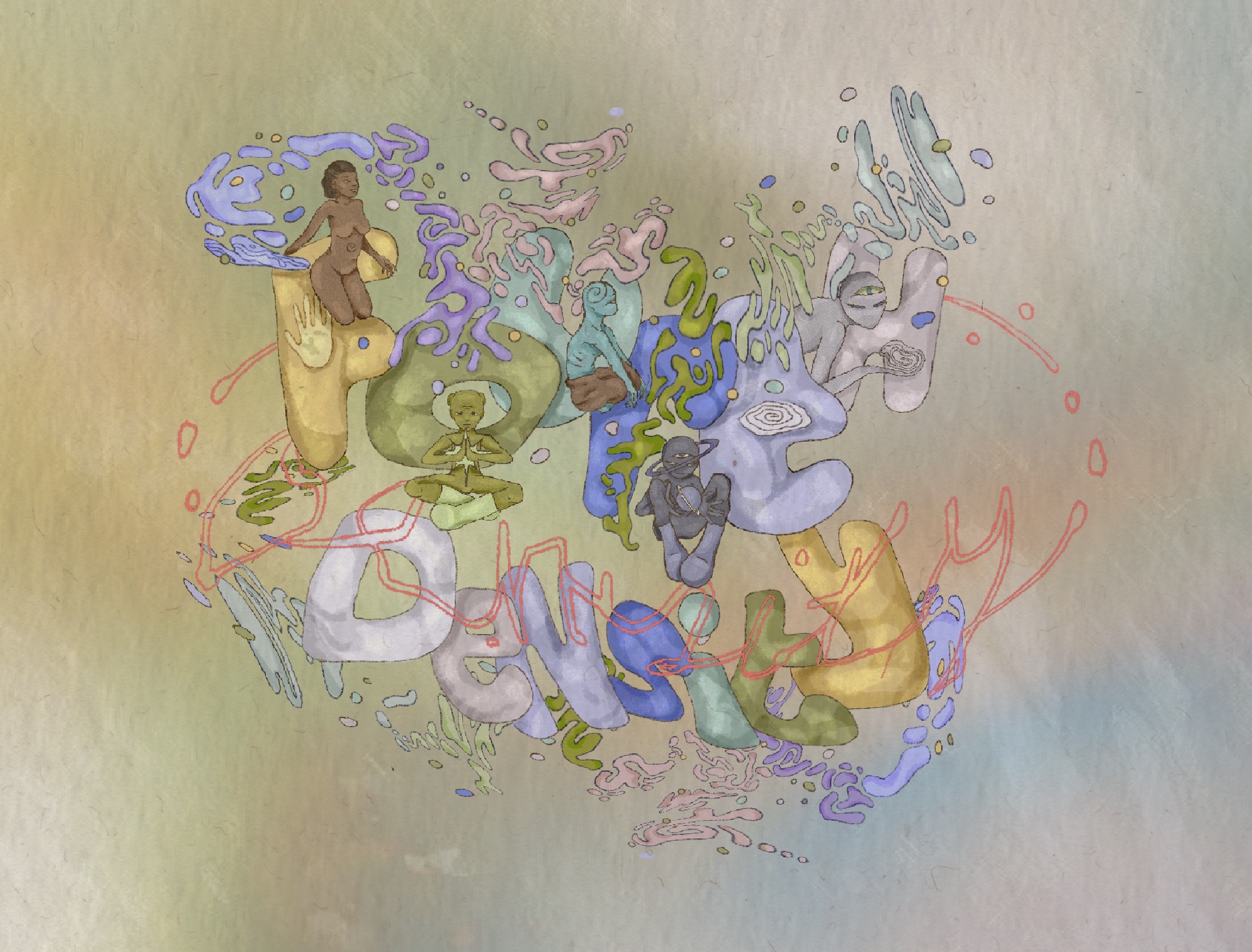 Collection title concept illustration. Reading “Fourth Density”, an alternative name for my collection. Exploring colour, form, illustration, and font development.
