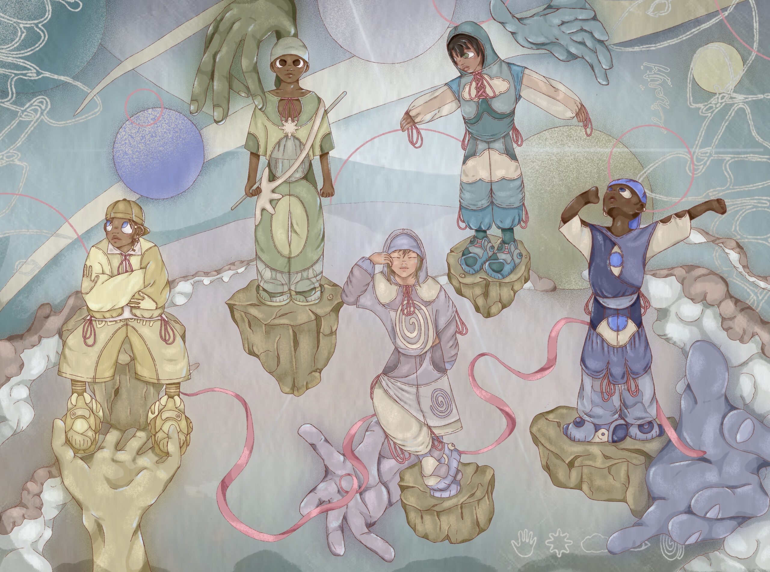 Editorial collection illustration. Executing the conceptual meaning of my collection through a dynamic tabloid illustration encoded with spiritual symbolism, depicting the stepping stones of soul evolution.