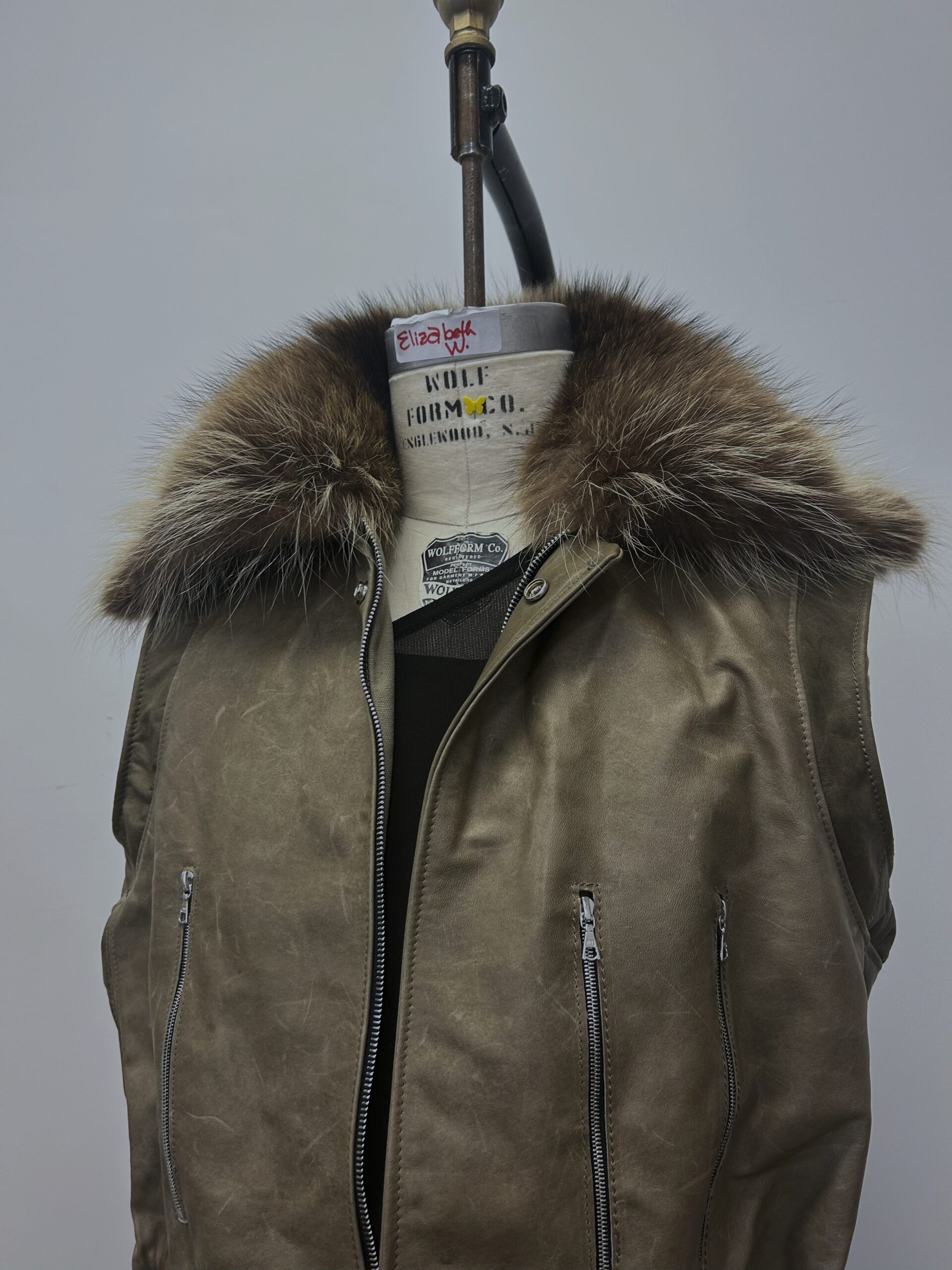 Brown leather vest with raccoon accent collar and silver hardware.
