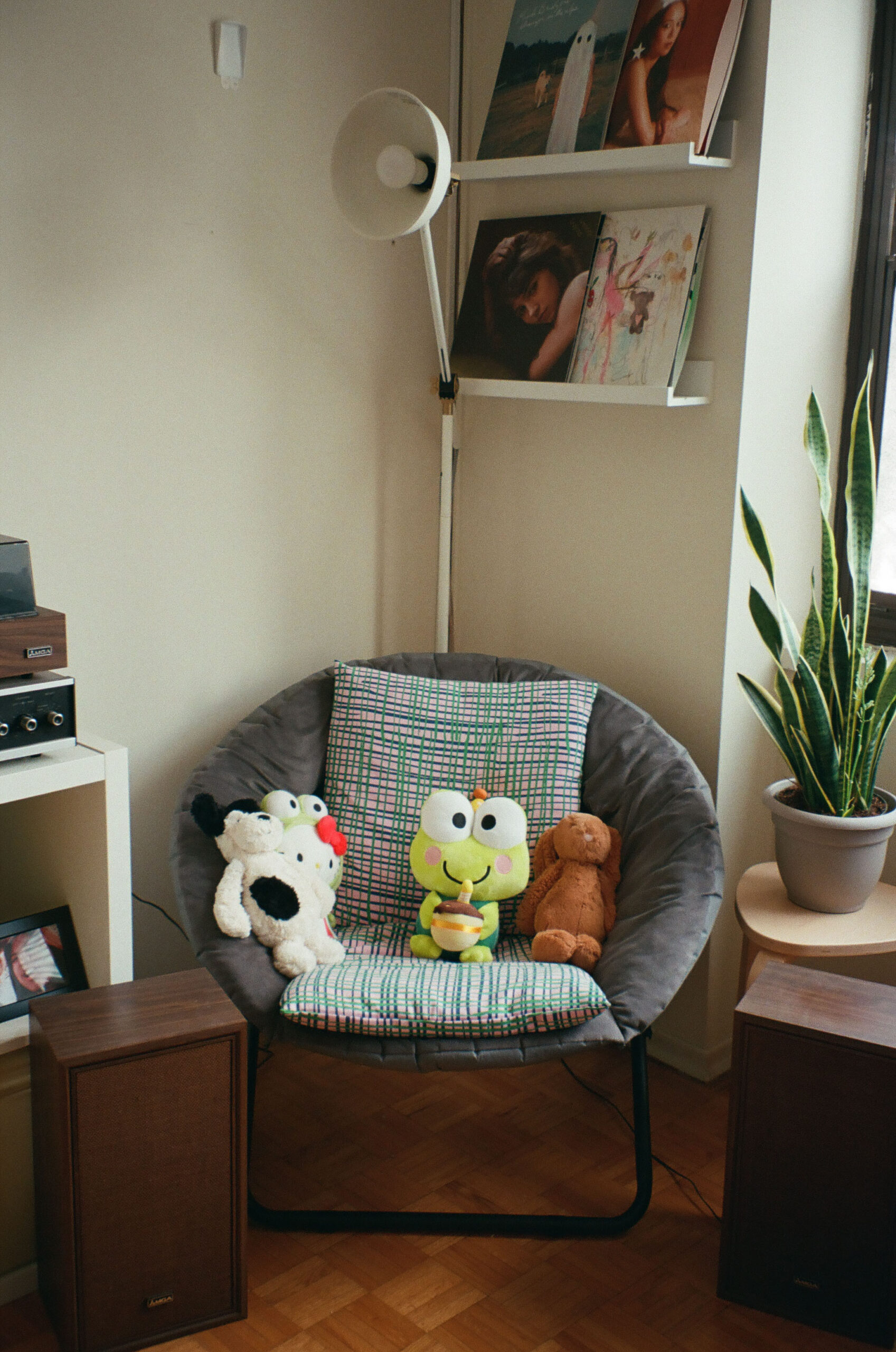 Home environment of a foldable grey loveseat with stuffed animals in the chairs. Hung decor of records on the wall with tall plant on the side.