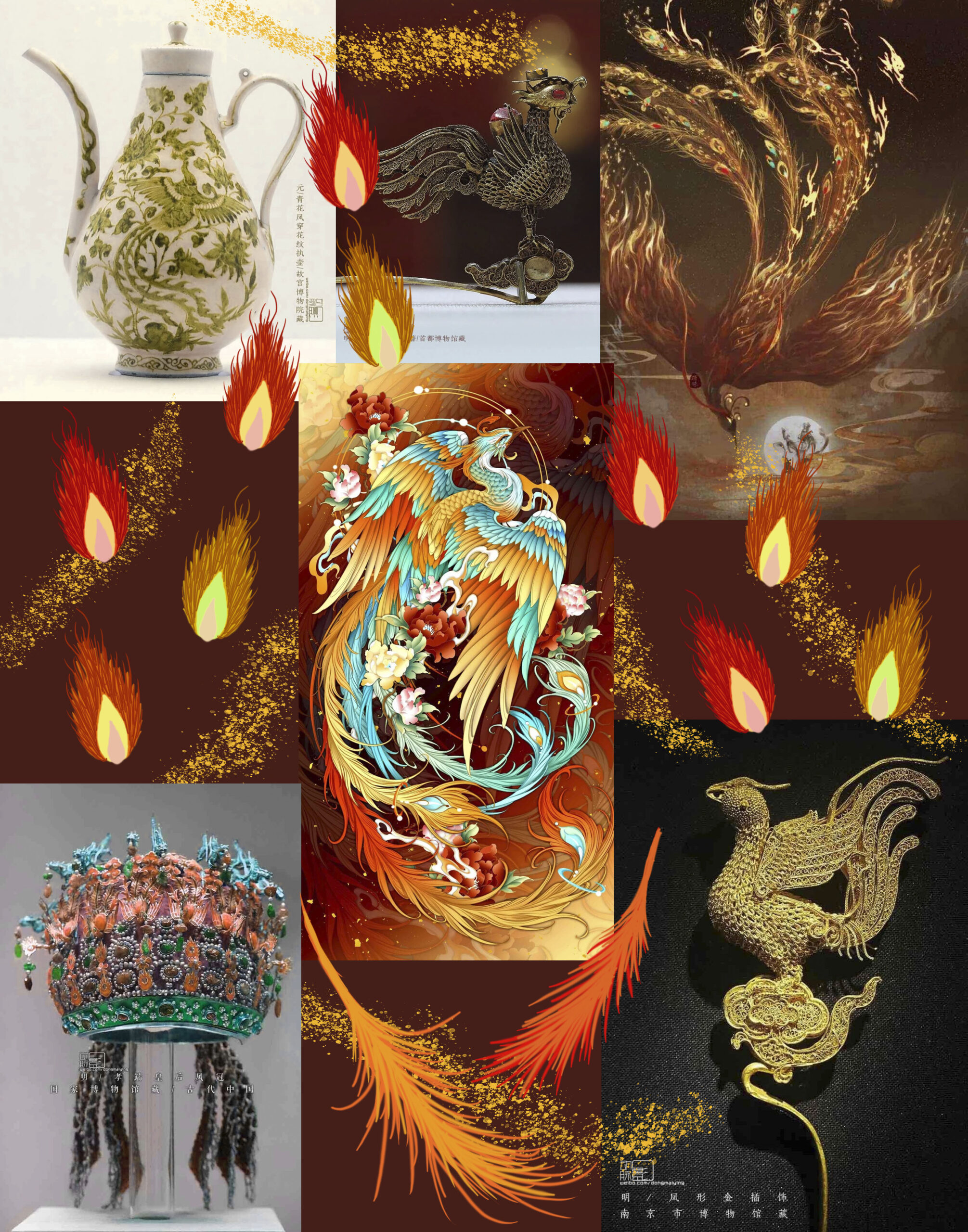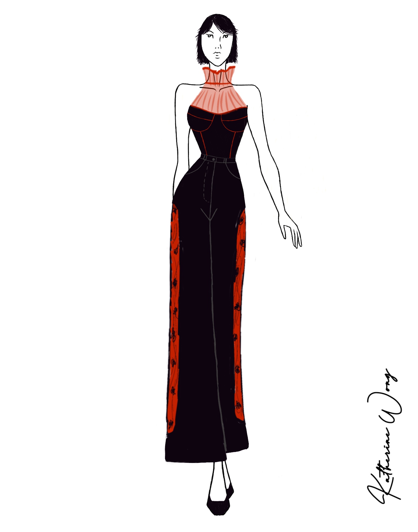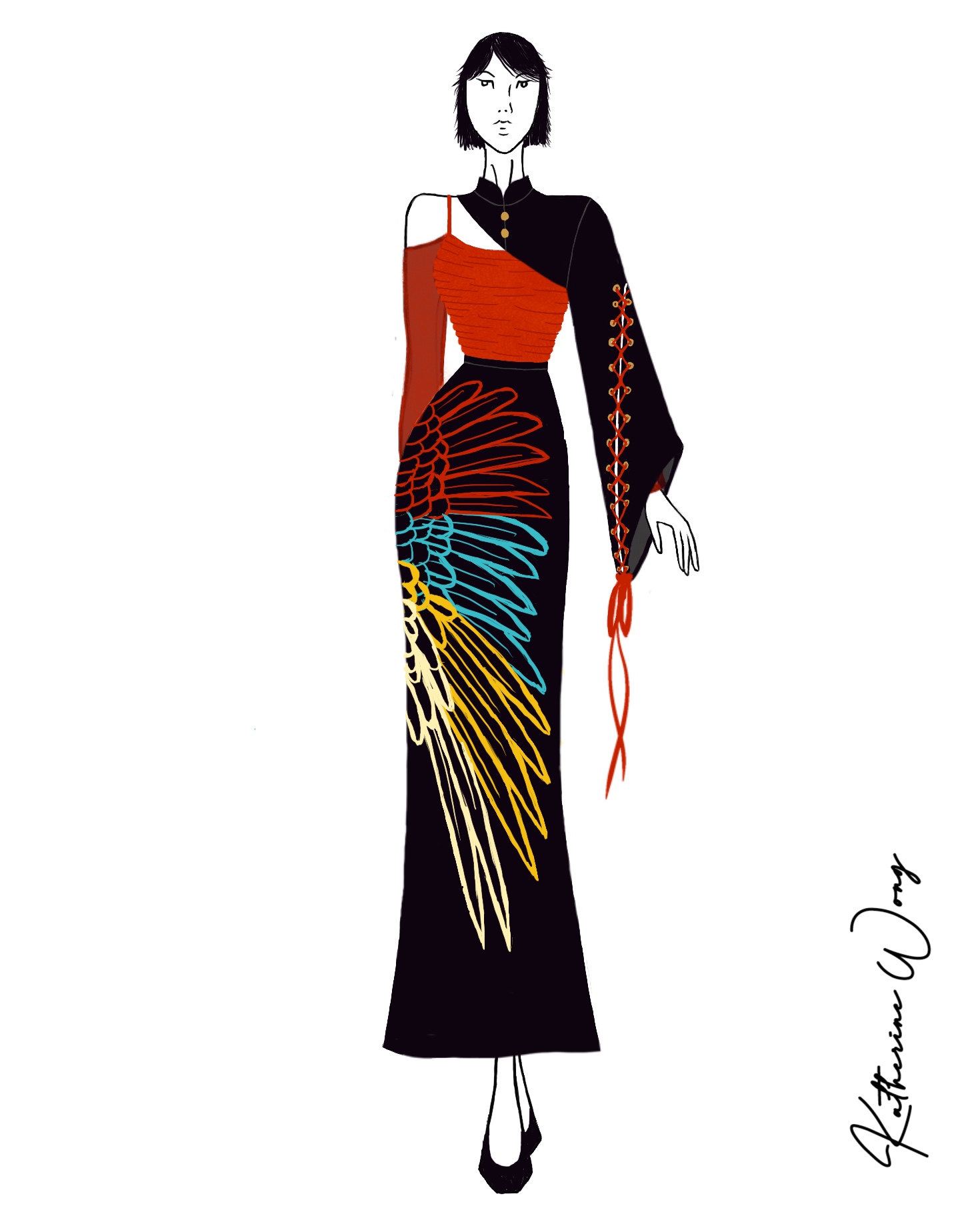 My collection is called Fèng Měi(凤美), which is my Chinese name meaning “Beautiful Phoenix”. This collection was inspired by the Chinese mythological Phoenix FengHuang. FengHuang is a very auspicious creature in Chinese mythology and is said to be a symbol of virtue, righteousness, courtesy, benevolence, and faith. Part of the mythology of the Chinese Phoenix is that it is not born from the ashes of fire like the western Phoenix. The Chinese Phoenix actually descends from Heaven and does so in a time of harmony and peace within an empire. I want this collection to represent the same harmony and peace between the Chinese community and other communities.