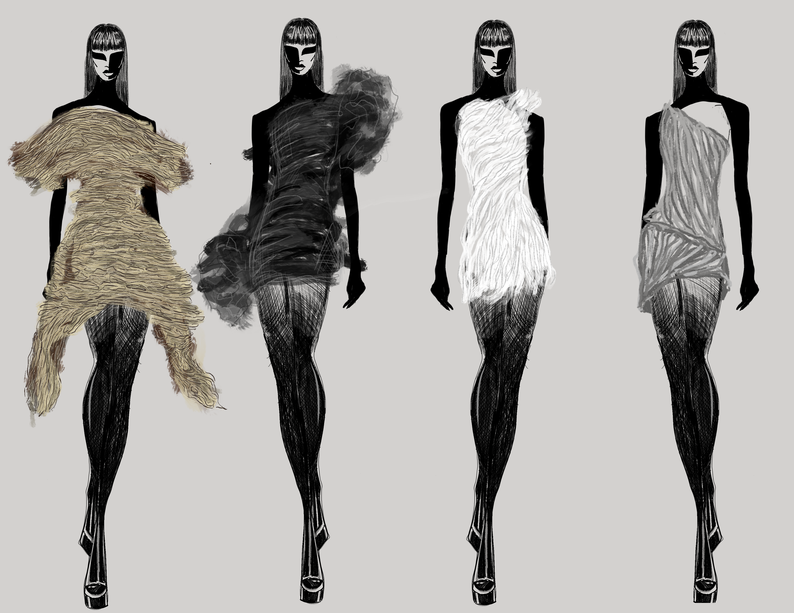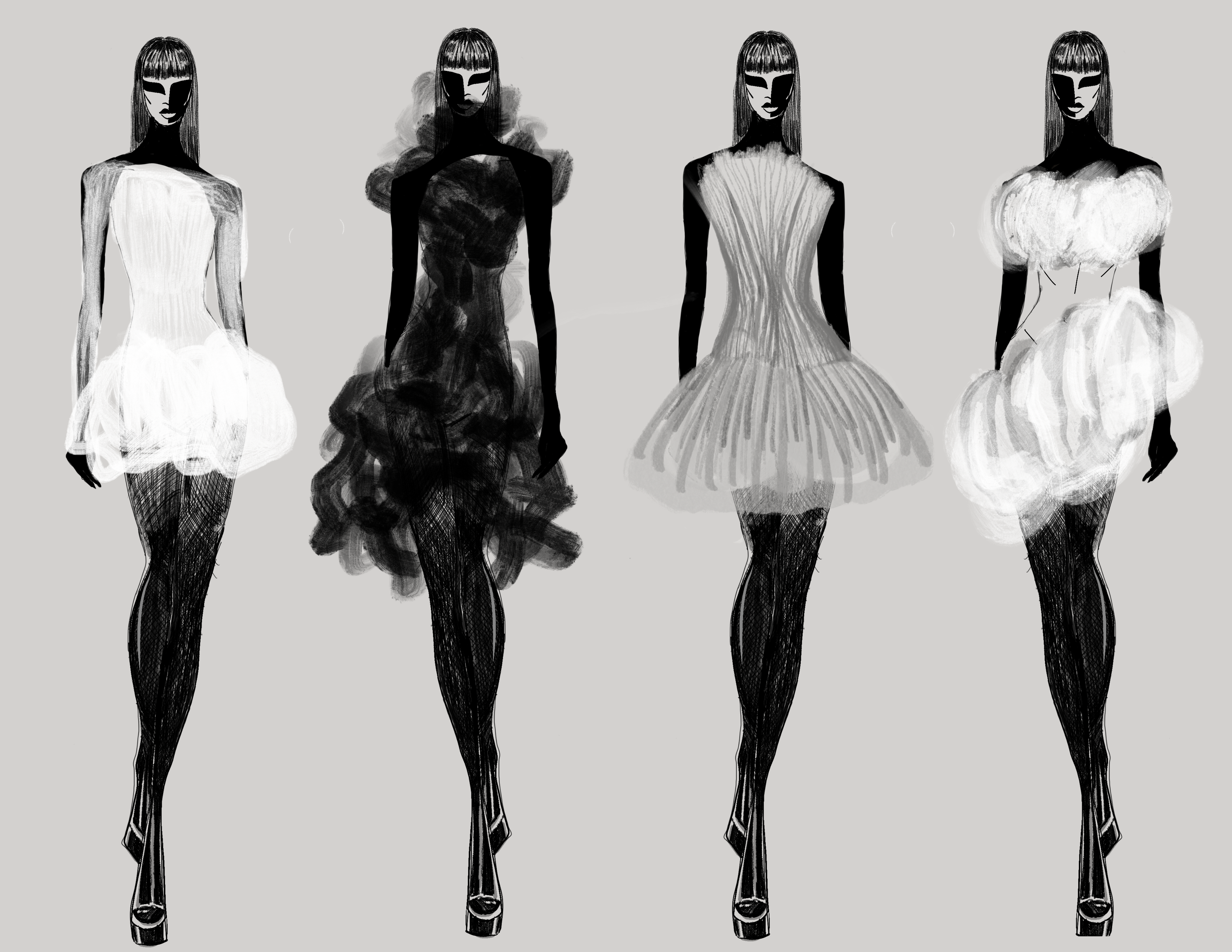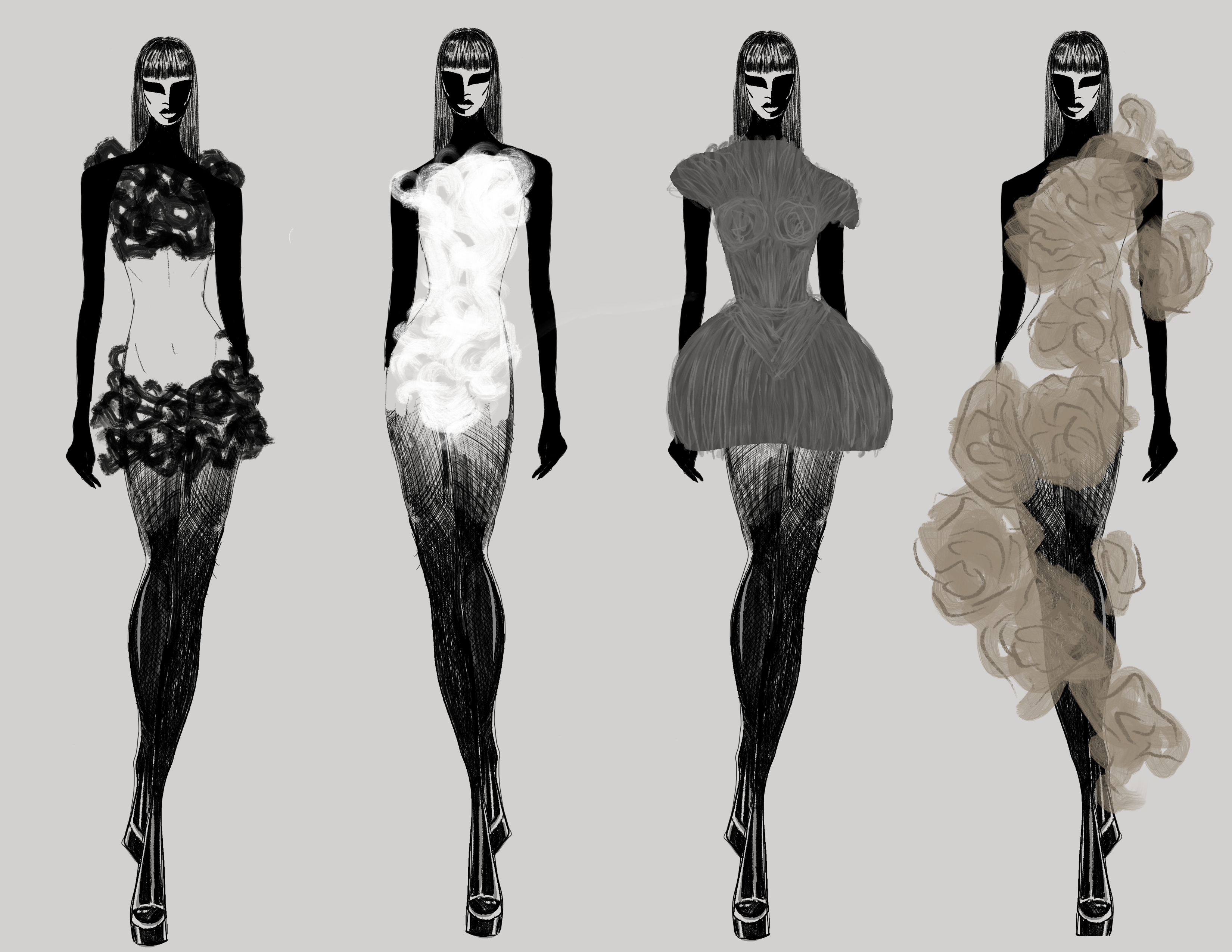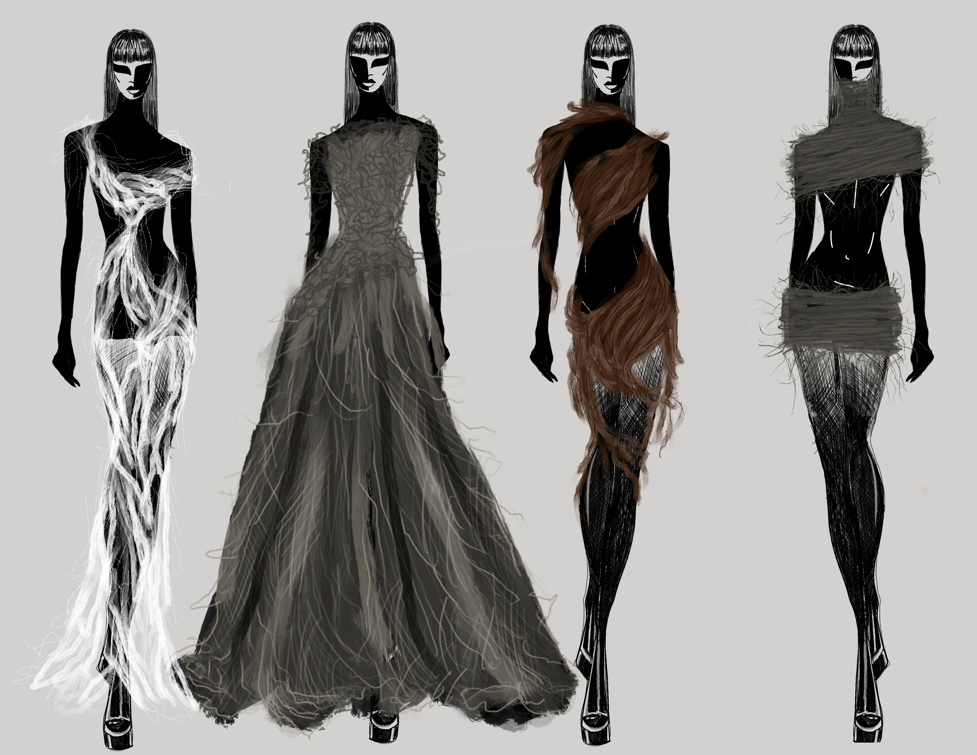 My work explores the intersection of personal evolution and environmental renewal, using fashion as a medium to reflect cycles of growth, loss, and reconnection. My capstone collection, Catharsis, delves into themes of eco-anxiety and resilience, beginning with constricted silhouettes that symbolize trauma and societal constraints and evolving into fluid, layered forms that embody healing and renewal. Each piece represents a circular journey, mirroring the fragmented and reconnected state of both the self and the world.