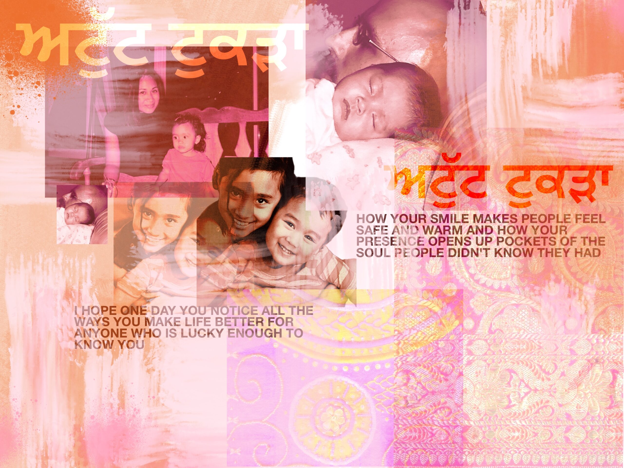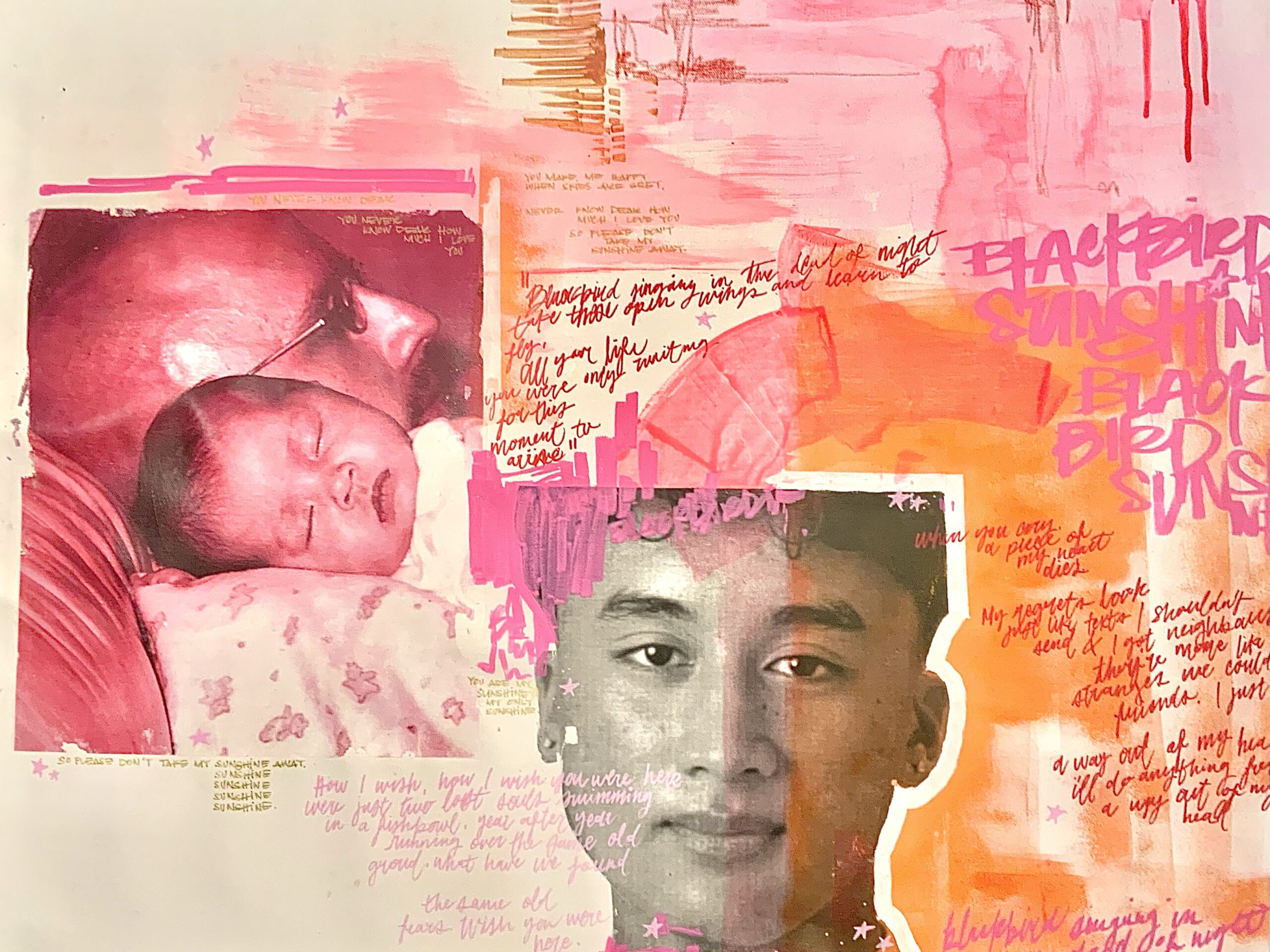 This mixed media painting on rolled canvas draws inspiration from the art of storytelling, presented in a layered, collage-like style that reflects my family’s tradition of scrapbooking — a hobby I grew up with and continue to cherish. Using a combination of paper, stamps, and textured elements, the piece weaves together fragments of memories and emotions. Large-scale family portraits blend with decorative layers and personal touches, mimicking the way stories are preserved and pieced together over time.