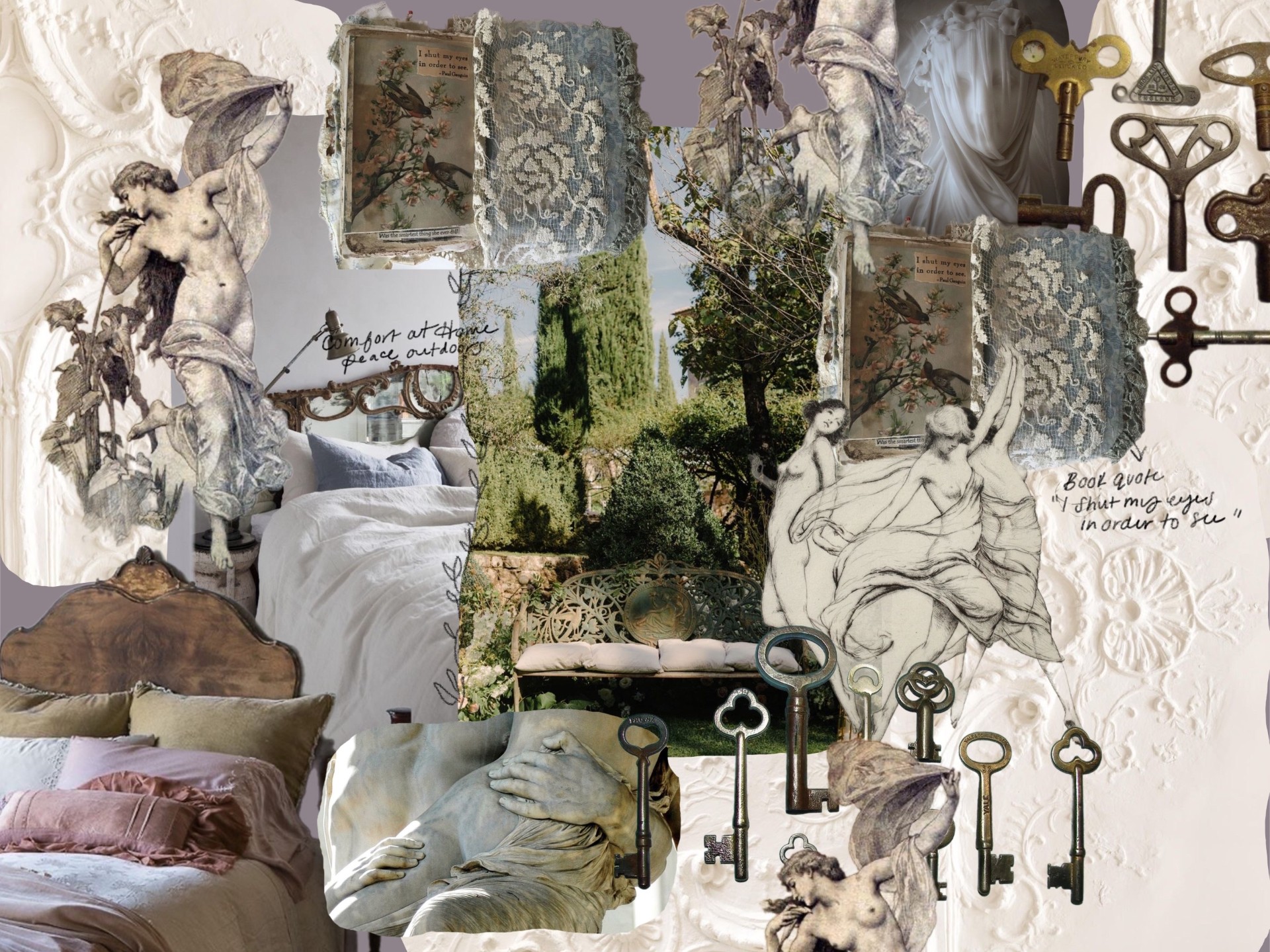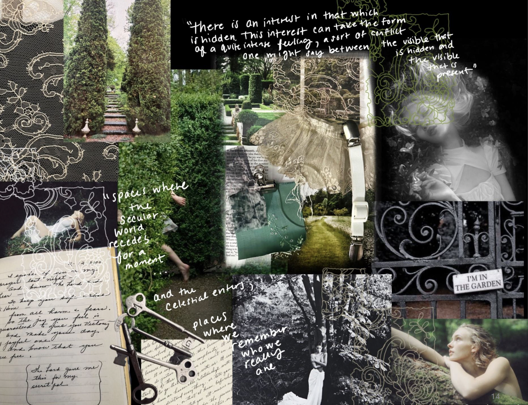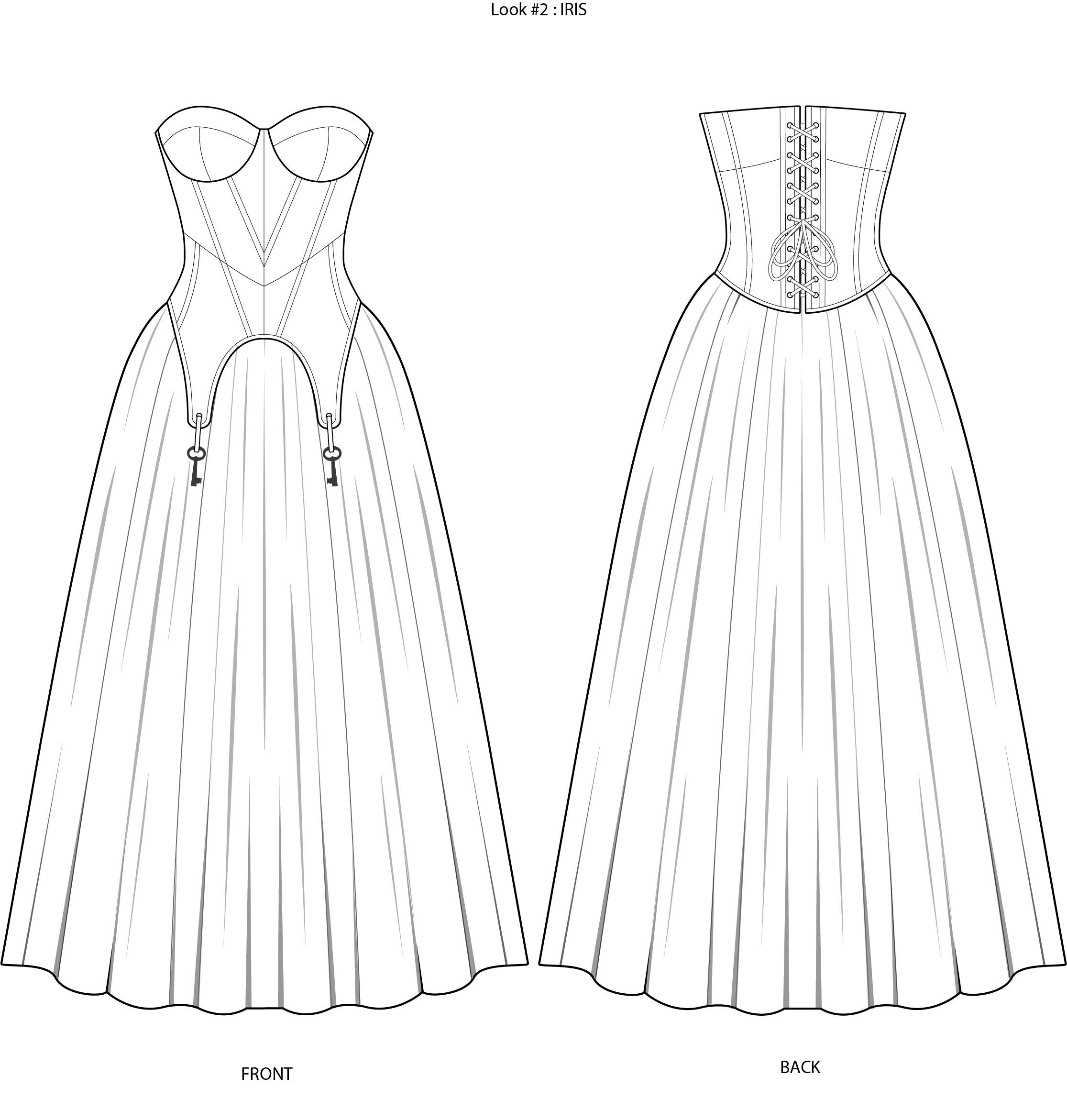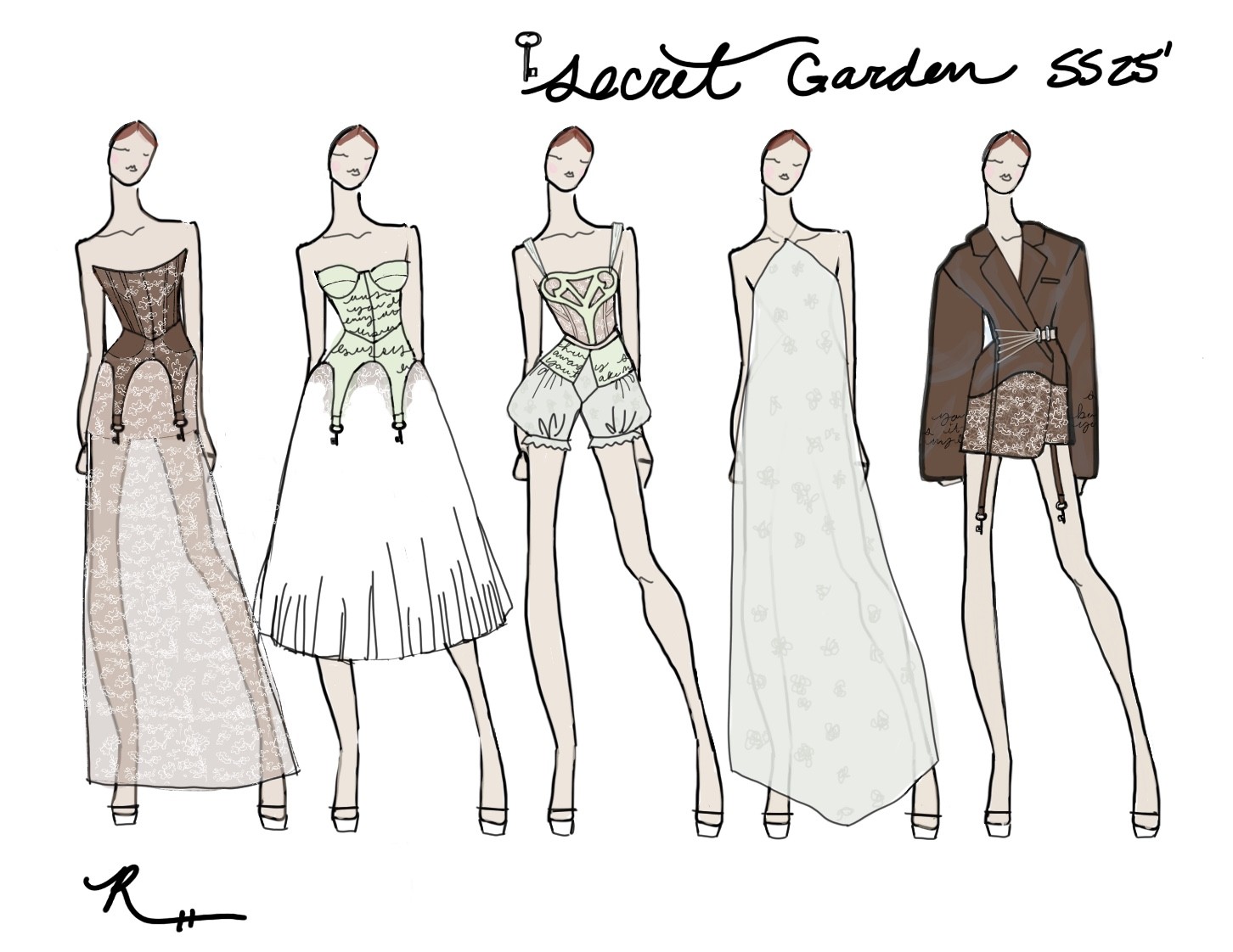 SECRET GARDEN is a womenswear collection comprised of separates and statement pieces that seeks to explore the complex feeling of being lost and subsequently found. Playing upon themes of nostalgia, femininity, self-discovery, youth, and our innate connection to nature – this collection is a love letter to the wearer. Inspired by the shapes found in modern and historical undergarments and dancewear, it is rooted in whimsy and mystery, striking a balance between the comfort found in structural corsets and the need for freedom and movement within the delicate fabrics that adorn them. Themes are expressed through the use of layering transparent fabrics, utilizing flower motifs, incorporating vintage skeleton keys, and French lace. While creating this collection, I was lost and found many times throughout the process, but the final result has been one ultimately informed by the beauty of nature, mystery, and how the human experience can be dramatically altered by our surroundings and what we wear.